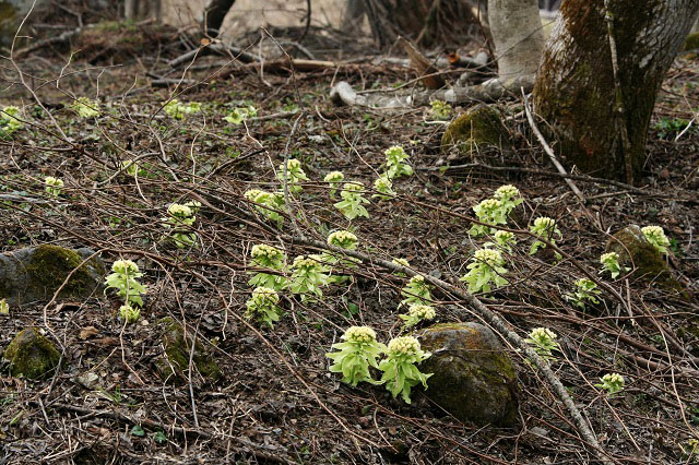 雌雄異株で、雌株は白色の花を、雄株は白黄緑色の花を密に散房状に付ける。雌株の中心部には少数の両性花がある。花後、株元から腎円形で幅15〜30cmの葉を伸ばす。