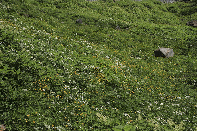 ハクサンイチゲとミヤマキンポウゲの大共演で歓迎してくれた。