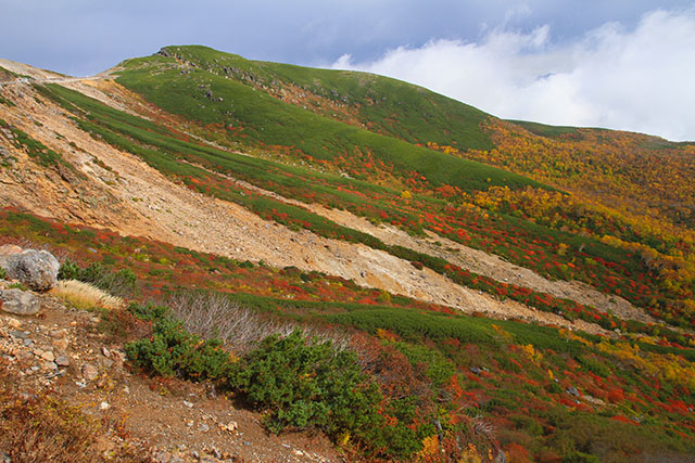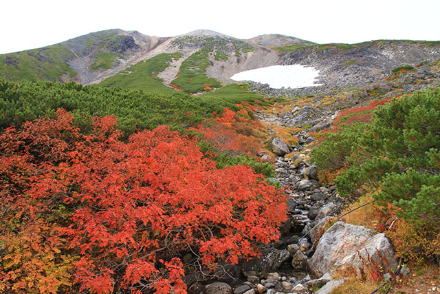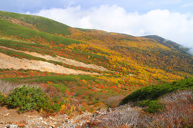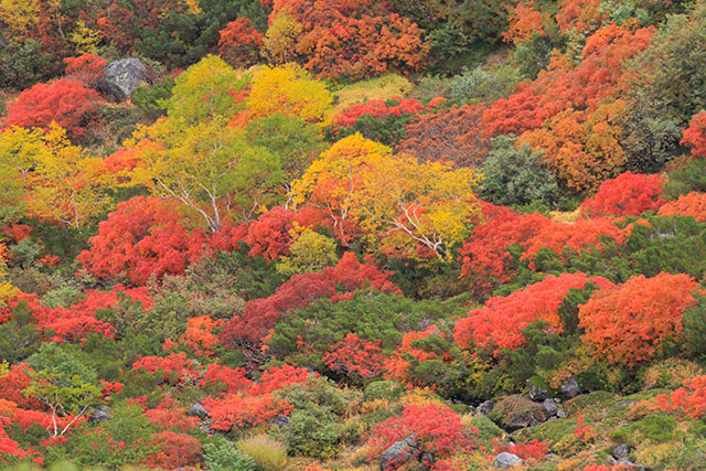ナナカマドの紅葉、ダケカンバの黄葉とハイマツの緑のバランスが絶妙。