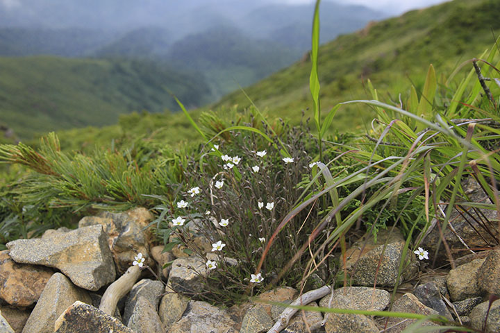 7月の至仏山の岩場なら、探さなくてもホソバツメクサを見つけることができる。